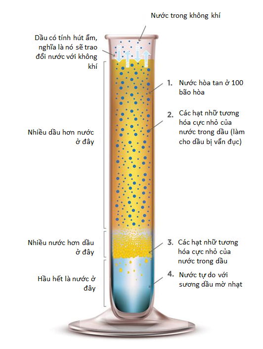 Nước hòa tan trong dầu bôi trơn tương tự như độ ẩm trong không khí. Dầu có thể chứa một hàm lượng nước hòa tan nhất định, nhưng chúng ta không thể nhìn thấy được.