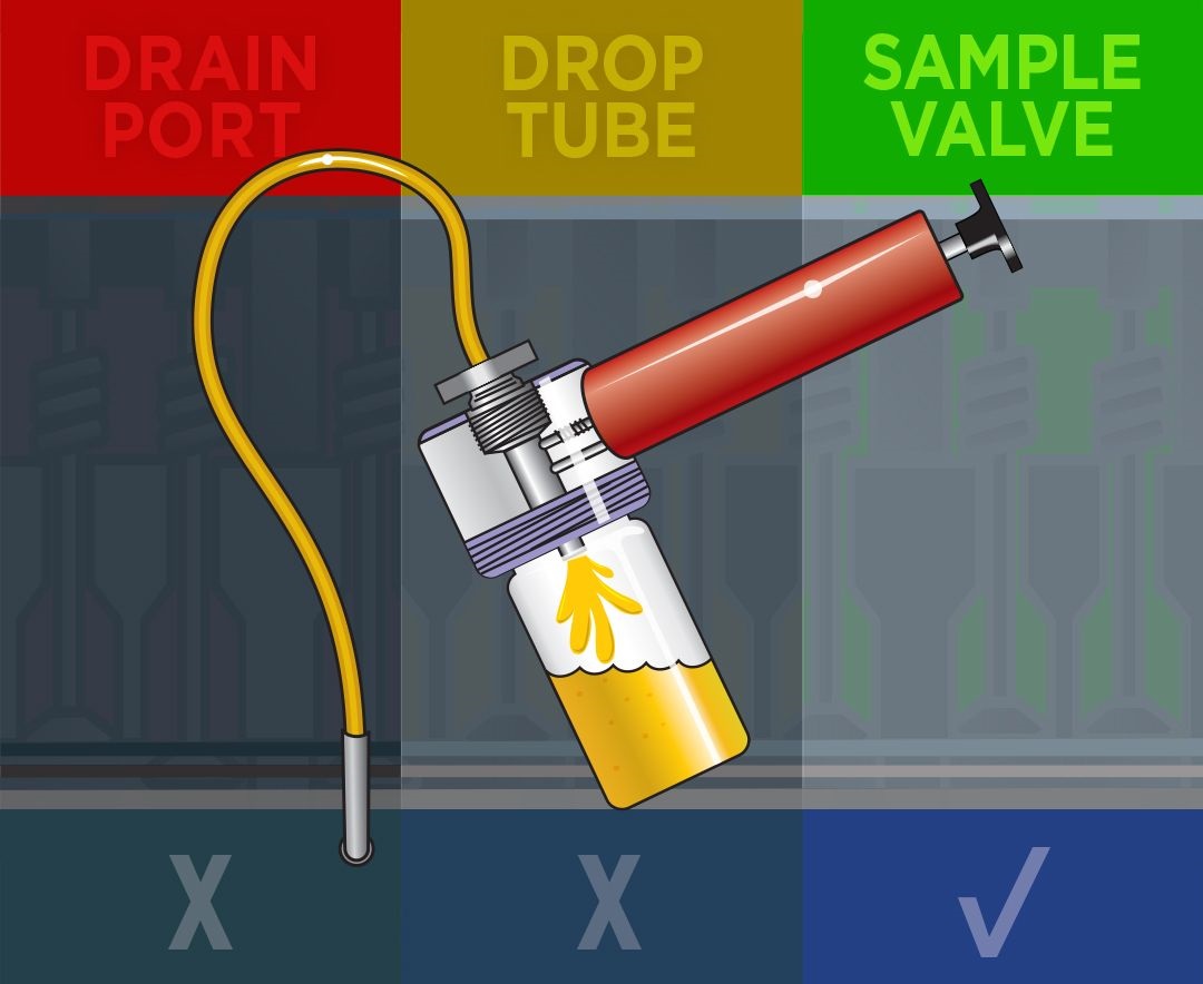 Thật không may, việc lấy mẫu dầu từ van xả là quá phổ biến. Mặc dù mẫu được thu thập từ cùng một vị trí mỗi lần, nhưng nó lại không được lấy từ vùng dầu đang hoạt động. Vì ống xả hoặc bể chứa của máy móc thường chứa đầy cặn lắng dưới đáy, nên các mẫu lấy từ đó có thể cho thấy mức độ kim loại mài mòn hoặc ô nhiễm cao hơn thực tế do các hạt mài mòn, chất gây ô nhiễm và nước lắng xuống đáy.
