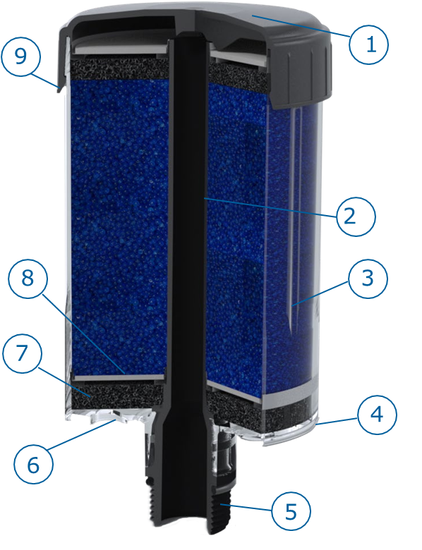 Lõi lọc Polyester loại bỏ hạt ô nhiễm trong không khí đến 3 micromet. Các vòng lặp độc đáo cho phép các hạt giải phóng trong quá trình thở ra của hệ thống, giúp tăng tuổi thọ của bộ thở.
