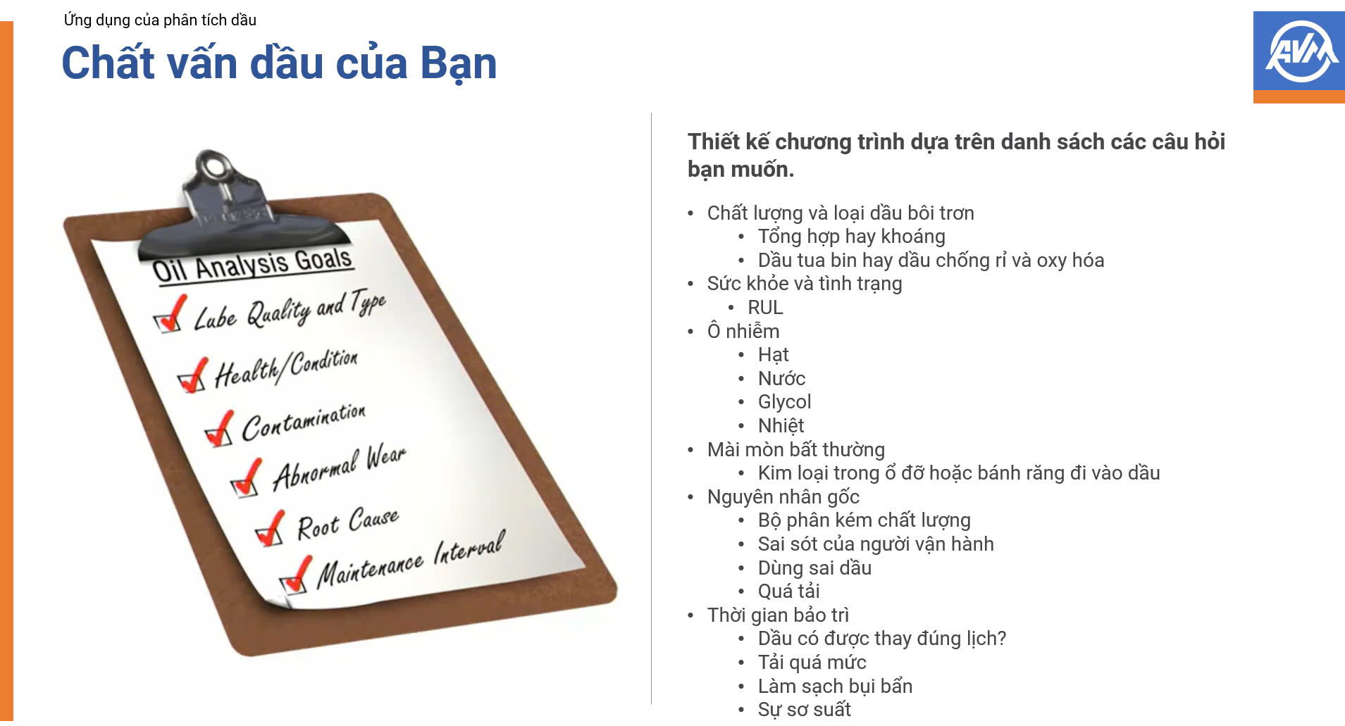 AVM Group sẽ giúp bạn thiết kế một chương trình phân tích dầu phù hợp với từng thiết bị và điều kiện vận hành thực tế, mang lại giải pháp bôi trơn toàn diện và hiệu quả cao cho doanh nghiệp của bạn.